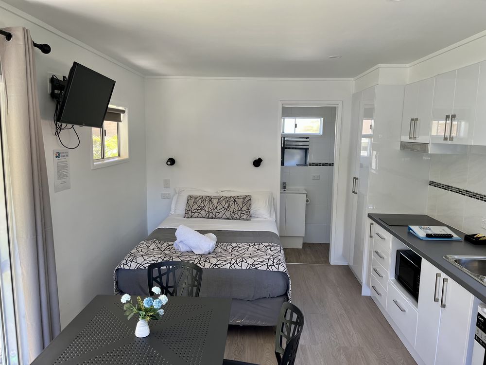 Diamond Waters Caravan Park has three self-contained ensuite cabins. Two of the cabins sleep up to 4 people and have a double bed and a set of single bunks. One cabin sleeps up to 2 people with a double bed. They are open plan so ideal for couples and small families.